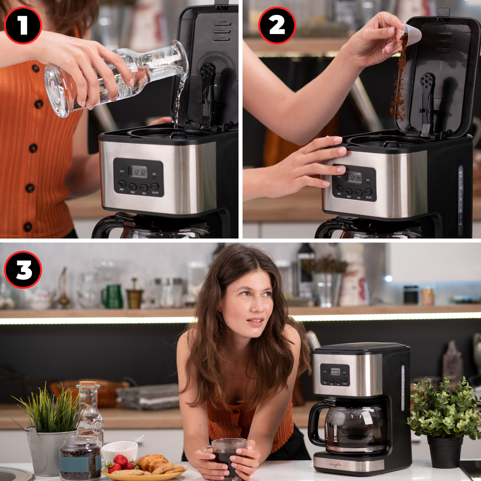 Cafetiera Myria MY4118 iti ofera gustul puternic si plin de savoare obtinut din cafeaua proaspat macinata. Trebuie doar sa te ridici din pat si sa te bucuri de ea, o gasesti in fiecare dimineata gata facuta. In orice moment, poti pregati rapid mai multe cesti de cafea datorita rezervorului din spatele aparatului de 1.5l.
