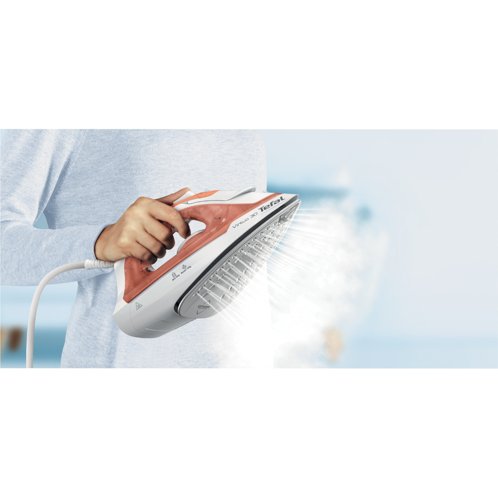 Iti prezentam fierul de calcat cu abur Tefal Virtuo, de mare performanta cu 2000 W care asigura un abur puternic pentru rezultate obtinute cu minim de efort de fiecare data. Descopera fierul perfect de calcat cu abur pentru ingrijirea exceptionala a tesaturilor: Indepartare eficienta a cutelor, timp rapid de incalzire de doar 30 de secunde, abur variabil si flux puternic de abur, talpa ceramica cu alunecare usoara, protectie antipicurare, varf profilat pentru precizie si multe altele.