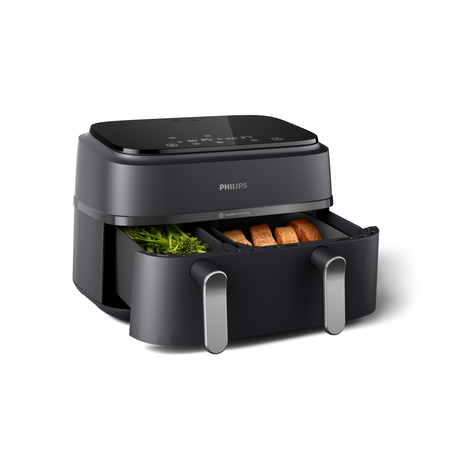 Airfryer cu 2 sertare: sertarul mare este perfect pentru feluri principale, cartofi prajiti si orice iti place cel mai mult. Utilizeaza sertarul mai mic pentru garnituri, legume si gustari.